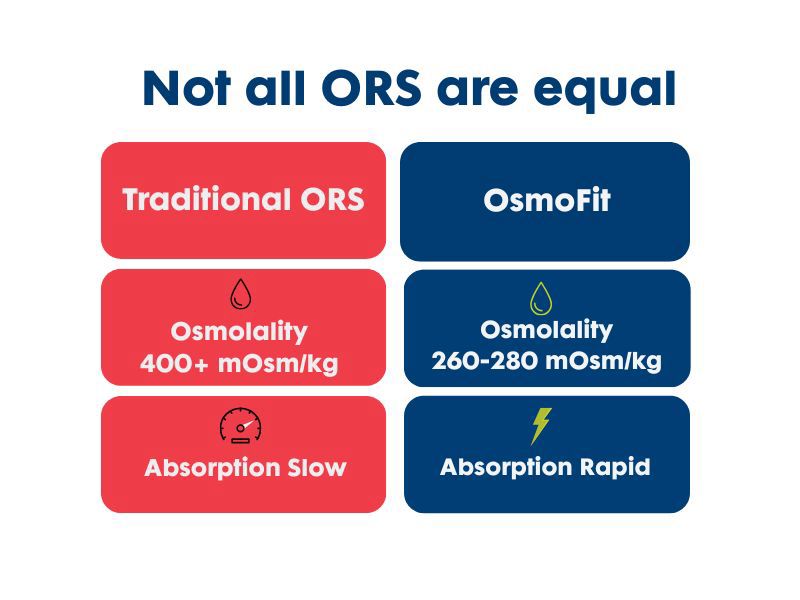 Tradiční produkty ORS mají často vyšší osmolalitu a pomalejší vstřebávání, což může zpozdit zotavení a snížit účinnost.