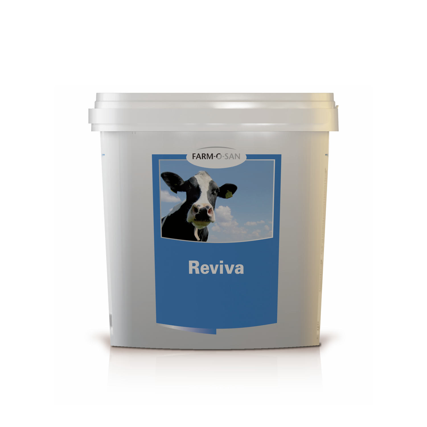 Farm-O-San Reviva je snadno stravitelný a vysoce chutný energetický nápoj pro čerstvě otelené krávy, který obsahuje dextrózu jako jeden ze zdrojů energie. Rychle rehydratuje a doplňuje minerální ztráty u krávy a pomáhá zvyšovat hladinu vápníku v krvi. Farm-O-San Reviva také obsahuje přidané vitamíny.