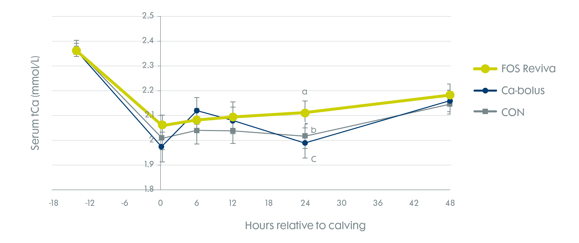 This graphic compares the use of a calcium bolus (Ca-Bolus), Farm-O-San Reviva and a control group (CON) after birth. With the bolus, it is clearly visible that the calcium content in the blood increases most rapidly but also falls to its lowest level after 24 hours. This means that although the bolus takes effect very quickly, the cows fall into a "calcium slump" again after 24 hours. With Farm-O-San Reviva the calcium content increases evenly and reaches its highest calcium level after 24 hours, which remains at its highest level 48 hours after birth.