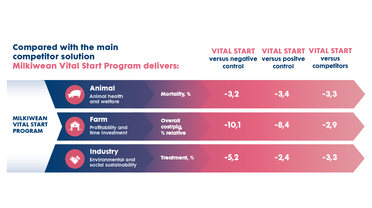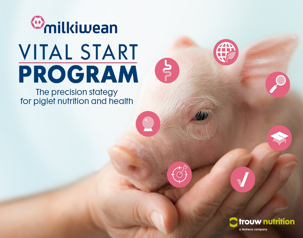 Program Milkiwean Vital Start umožňuje optimálně podporovat vývoj selat během náročného procesu odstavu, a to udržitelným způsobem. Mezi klíčové vlastnosti programu patří chutnost, která je nezbytná pro podporu pravidelného a zdravého příjmu krmiva v raných fázích života, a také výběr vysoce kvalitních zdrojů bílkovin pro zajištění optimální stravitelnosti.
