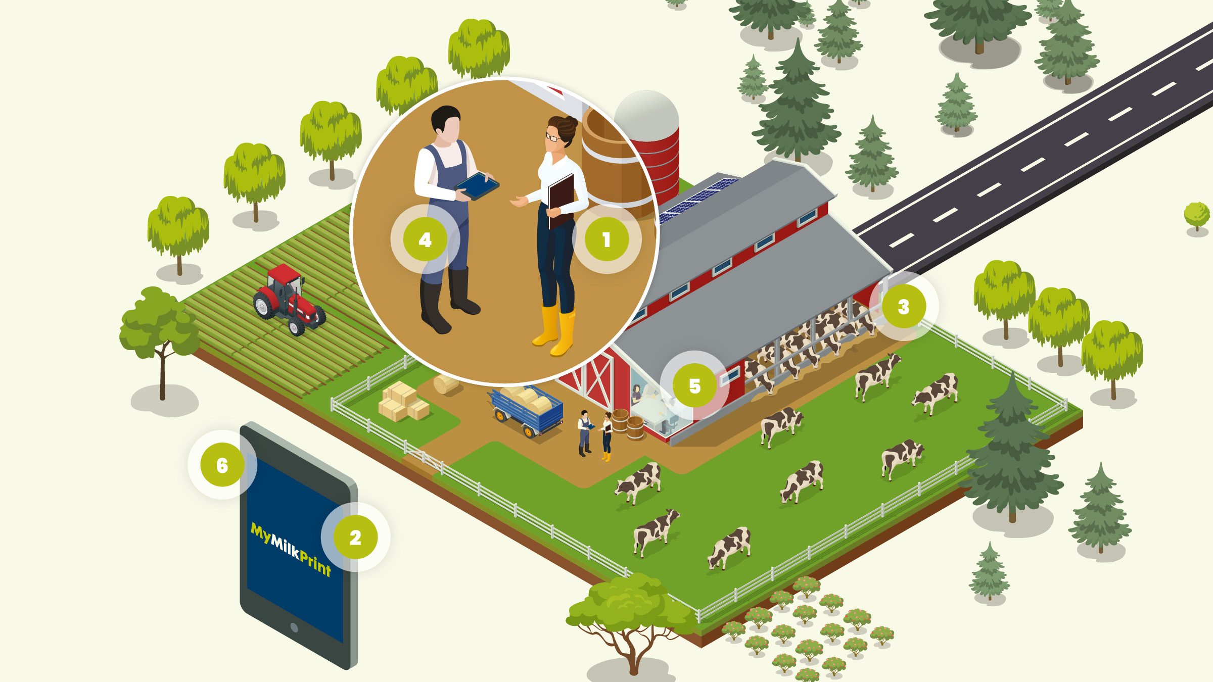 Analyzujte svůj současný stav pomocí MyMilkPrint a stanovte základní uhlíkovou stopu na kilogram mléka s korekcí tuku a bílkovin (FPCM) s ohledem na počet zvířat, nakoupená a lokálně produkovaná krmiva, krmné dávky, energii a hospodaření s hnojivy.