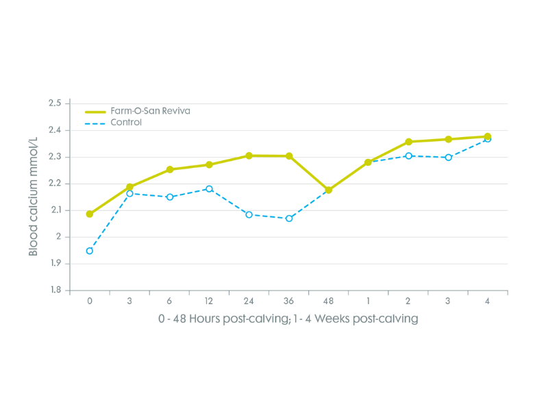 Farm-O-San Reviva is an easily digestible, highly palatable energy drink for cows. It contains the electrolytes, calcium and energy the cow needs to restore energy after calving, in a rapidly metabolisable formulation. It should be given immediately after calving. This energy booster stimulates the cow’s activity, dry matter intake and increases the blood calcium level post calving, which is clearly visible in this graphic. This contributes to a good start of milk production and improves health.